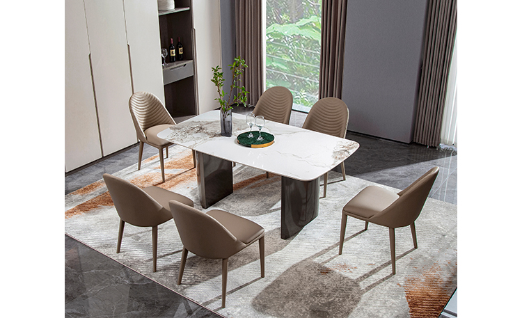 用最簡單的幾何造型組合成不拘一格的前衛設計。以“圓”為核心,餐桌面是沒有棱角的橢圓形,餐桌腿是兩個切角的半圓。本應是十分柔和的設計組合,卻用了巖板和不銹鋼的材質,為整張餐桌增添了一分凌厲的美感;
